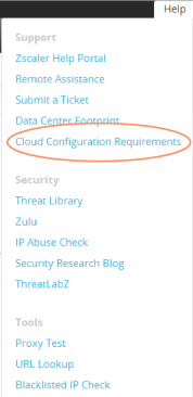 To view the firewall requirements, log in to the Zscaler service and go to Help > Cloud Configuration Requirements.